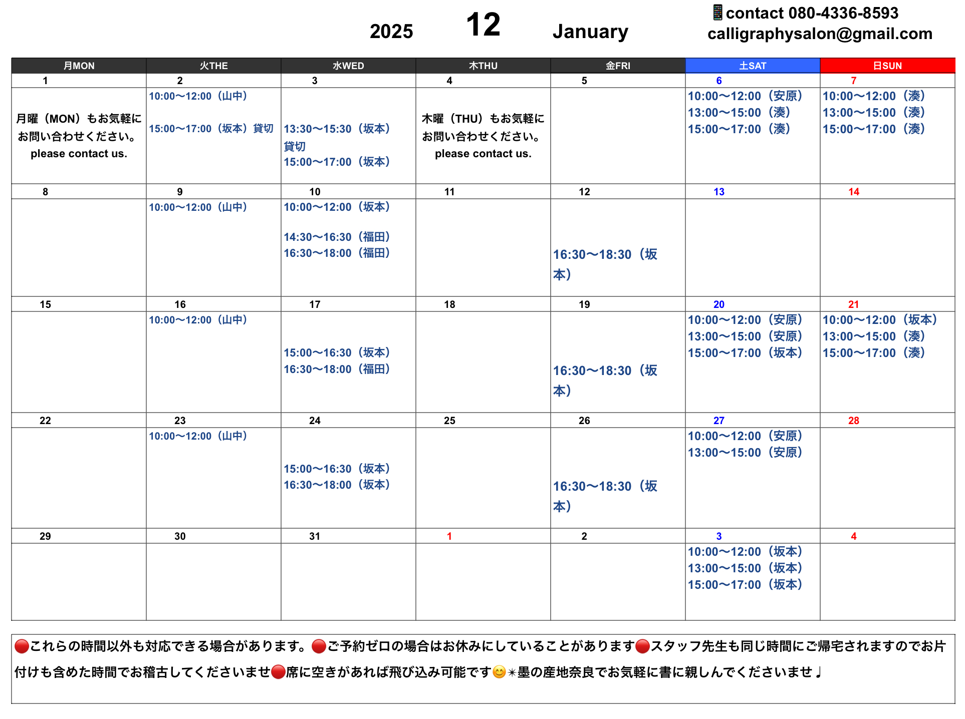 ※青文字…学生、一般、観光のすべての方Lesson可能な時間帯です。
